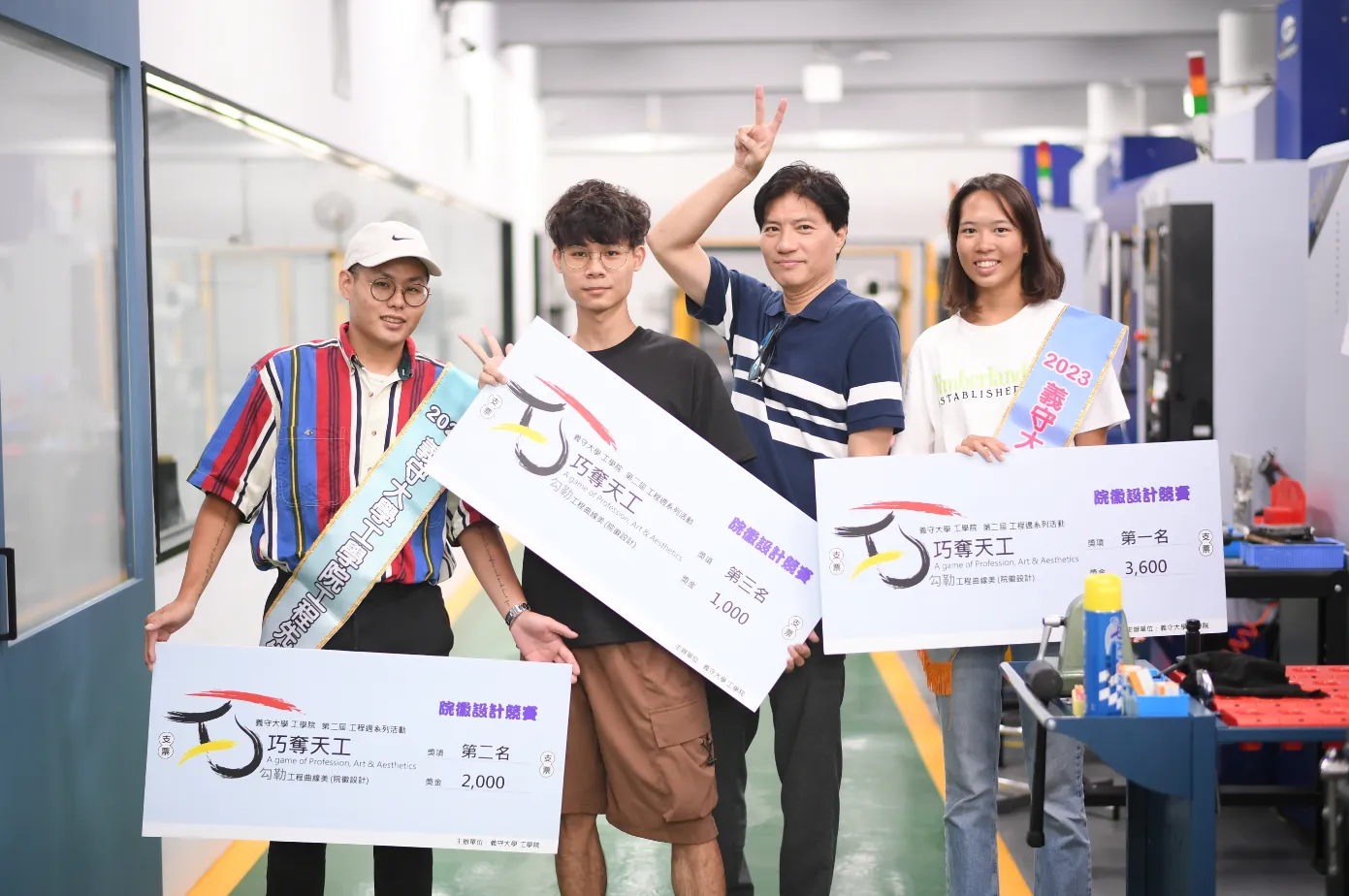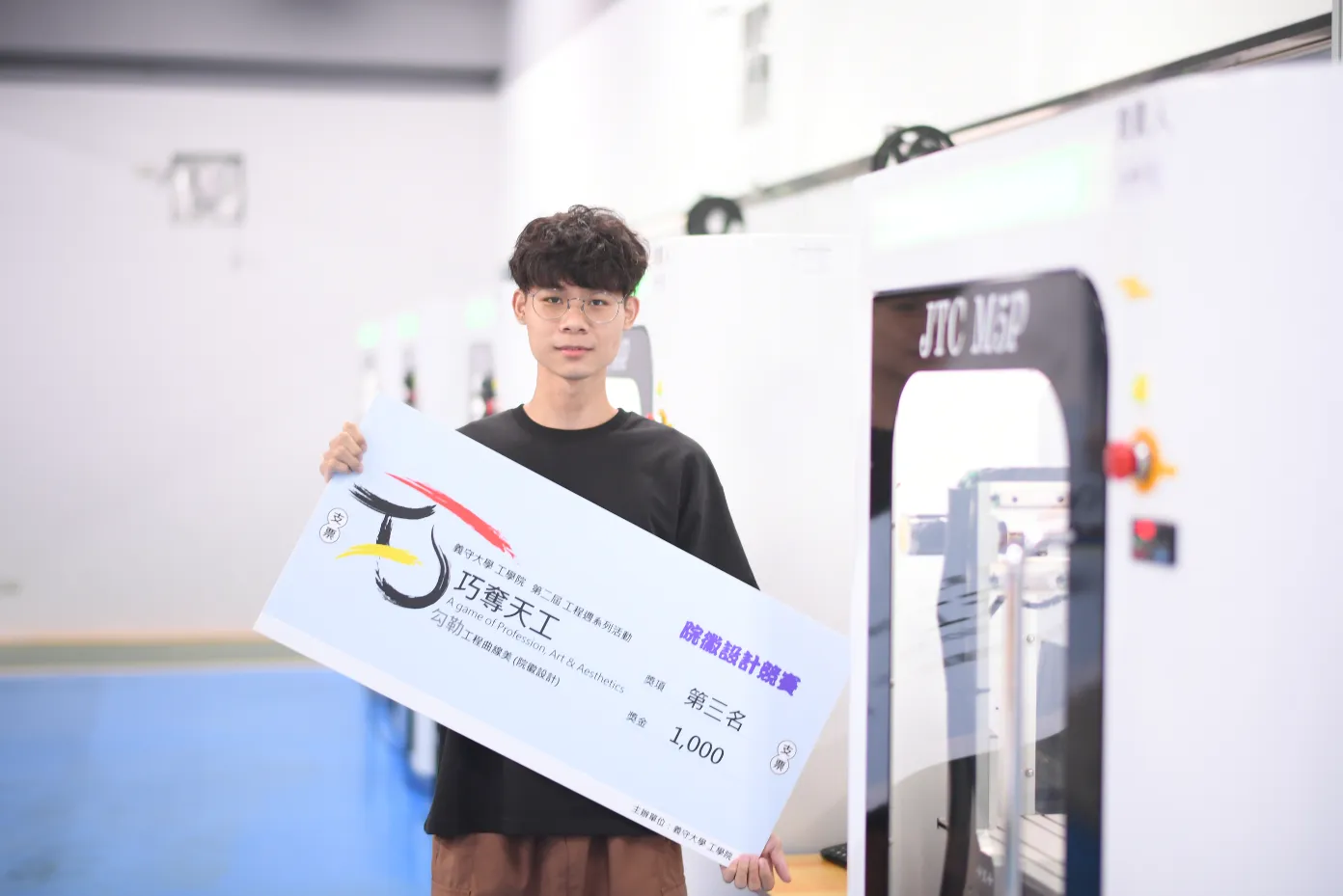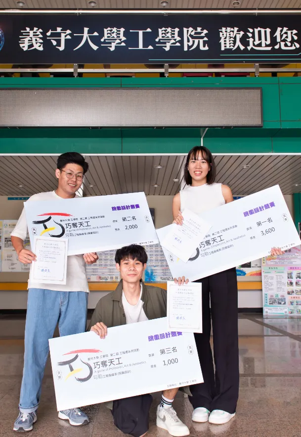 院徽設計競賽Facebook活動頁面獲獎作品【一體同心】以Engineering的首字母E做為主要視覺呈現,將四個系的元素及著重之精神做結合,E的發音同音中文「一」的發音,以示工學院就如同一個大家庭。第一名:機械系 | 邢智綺【Cosmically Engineering】在三環中構築著工學院內各系形象化表現,由內而外環環相扣,象徵著各系嚴密的緊繫互動,似宇宙中行星的互相牽引。作品中心的水滴,顯工學院培育人才積極灌溉,使前續光景川流不息、源源不絕。第二名:機械系 | 林郁翔【Craftsman spirit匠人の精神】這是一支結合各系象徵為一體的榔頭(房子-土木、原子-材料、齒輪-機械、量瓶-化工),合在一起象徵著匠人每天都會接觸的那把鍛造工具(榔頭),向人們傳遞著身為理工人的匠人精神,匠人精神是敬業、精益、專注與創新的體現,專業的人總是做著簡單的事,重複著、用心著。第三名:機械系 | 史耀綸活動照片【機械系】為本屆最大贏家第二屆工程週系列活動得獎學生合影第一名:機械系|邢智綺第二名:機械系|林郁翔第三名:機械系|史耀綸